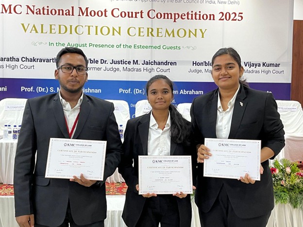 Students of S Thangapazham Law College participated in the First National Level Moot Court Competition organized by KMC Law College, Tiruppur on 25th to 27th September, 2025. The team comprising Durga and Ishwarya Lakshmi from III B.A., LL.B, and Abraham Patrik from IV B.A., LL.B represented the college in the competition.